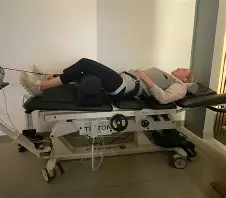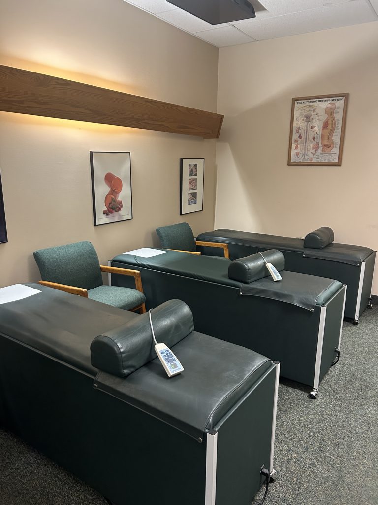 This is our Therapy Bay. These specialized therapy tables gently massage and traction your spine as you relax and rest. Your comfort, trust, and health are our top priorities.